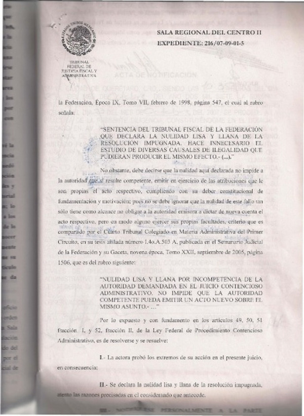 Sentencia del Tribunal de Justicia Administrativa. En seguimiento del asunto anterior y una vez que se gana el amparo, se emite un nuevo acto que igualmente se anula ahora en el Tribunal Federal de Justicia Administrativa, derivado del mismo procedimiento de rescisión administrativa de un contrato de obra pública.