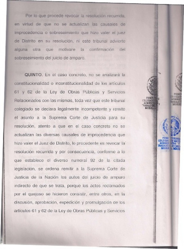 Amparo en revisión en el que se había desechado una demanda de amparo que impugnaba la inconstitucionalidad del procedimiento de rescisión de contrato de obra pública, en base a la Ley de Obras Públicas y Servicios Relacionados con las Mismas, y el asunto se envía a la Suprema Corte de Justicia de la Nación para el análisis de constitucionalidad procedente .