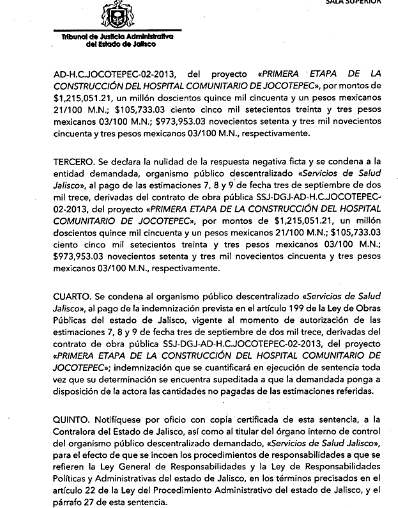 Resolución del Tribunal de Justicia Administrativa de Jalisco condenando el pago de estimaciones a empresa constructora de hospitales.